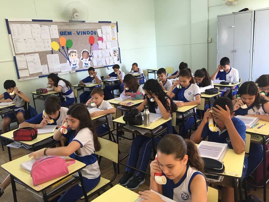 O uso do “sussurrofone” no momento da leitura com as turmas do 6º ano. Um jeito novo é lúdico de aprender.